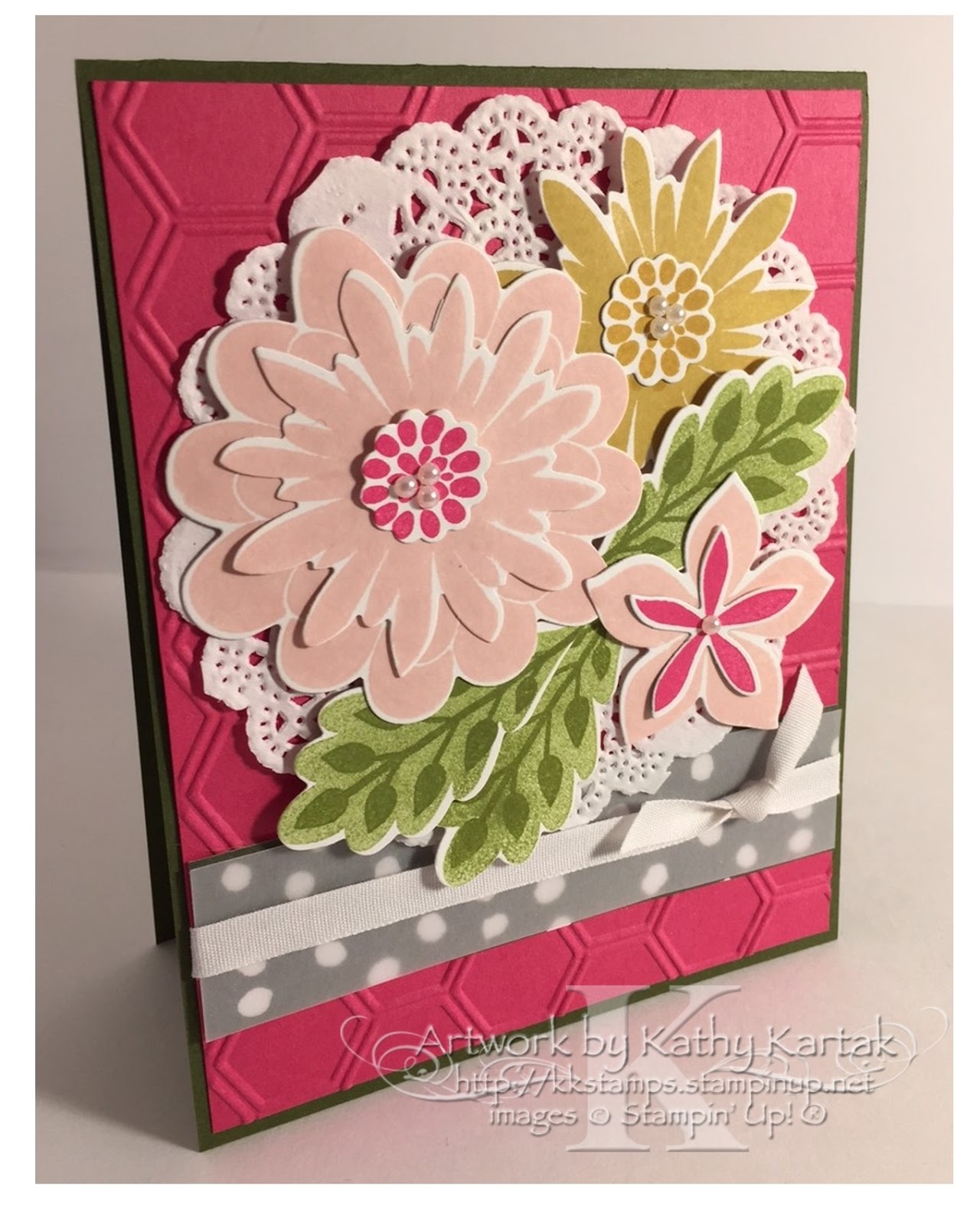 The whole assembly is adhered to a Melon Mambo panel that I embossed with the Honeycomb Embossing Folder and then to a Mossy Meadow card base. I added some small Basic Pearls to the centers of the flowers to complete the card.