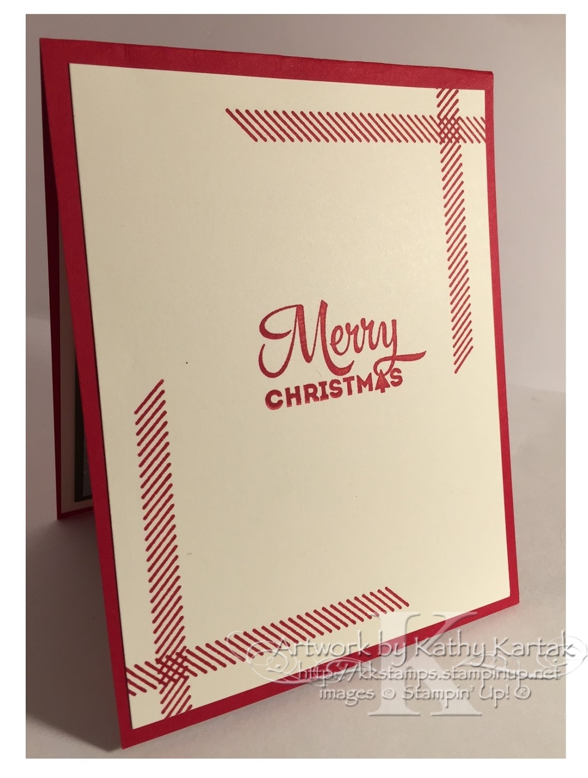 When I finished, I realized I hadn’t done any stamping, so I added a Very Vanilla panel to the inside of the card and stamped the corners in Real Red with the banner from the “Lots of Joy” stamp set and added the “Merry Christmas” sentiment.