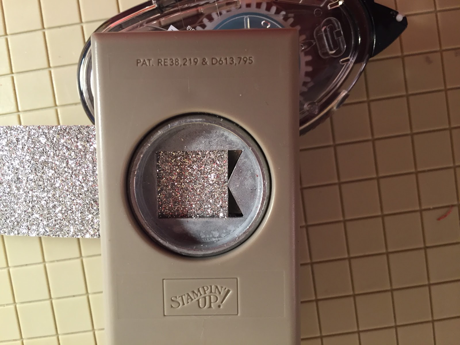 Next, I used the 1″ Square Punch to punch a piece of Black Glimmer Paper and the Banner Punch to punch a square of Dazzling Diamonds Glimmer Paper. Here’s how to make a small square with the banner punch.