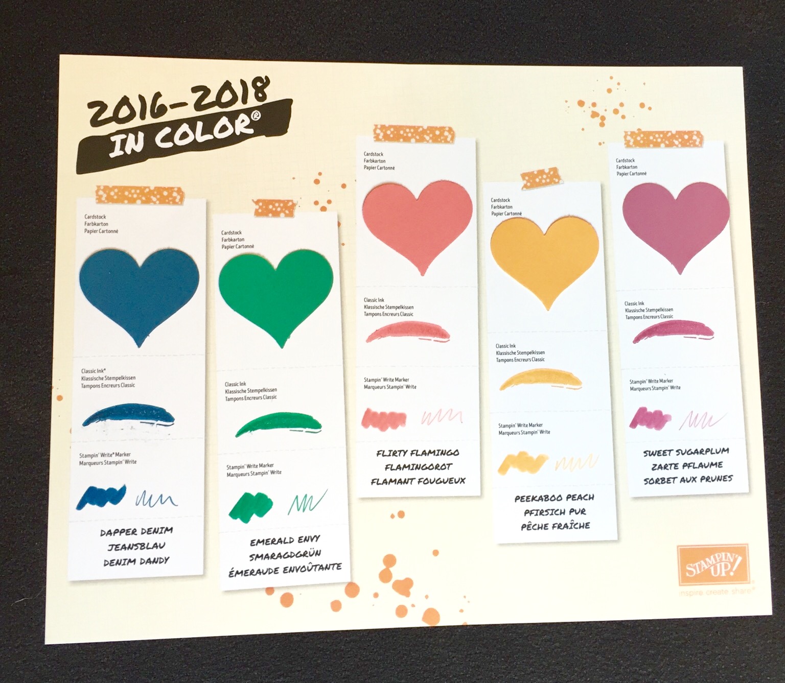 Drum roll, please…the new In Colors are Dapper Denim, Emerald Envy, Flirty Flamingo, Peekaboo Peach, and Sweet Sugarplum. Here’s the color swatch project we made and the card stock pieces.