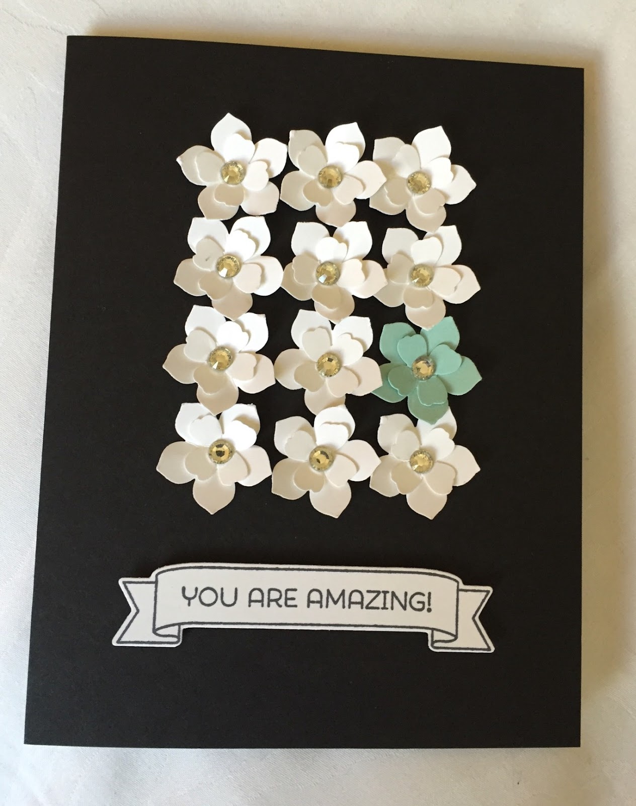 I love this card for the subtle pop of color. The artist, I think it was Laura Fernsler (I sent everything home already and don’t have these cards with me right now), punched ten flowers using the Petite Petals Punch and ten flowers using the flower stamp from the Itty Bitty Punch Pack (retiring). She adhered these in a grid onto a Basic Black card base and added a Basic Rhinestone in the center of each. She also punched one Petite Petals flower and one Itty Bitty Punch Pack flower in Soft Sky.