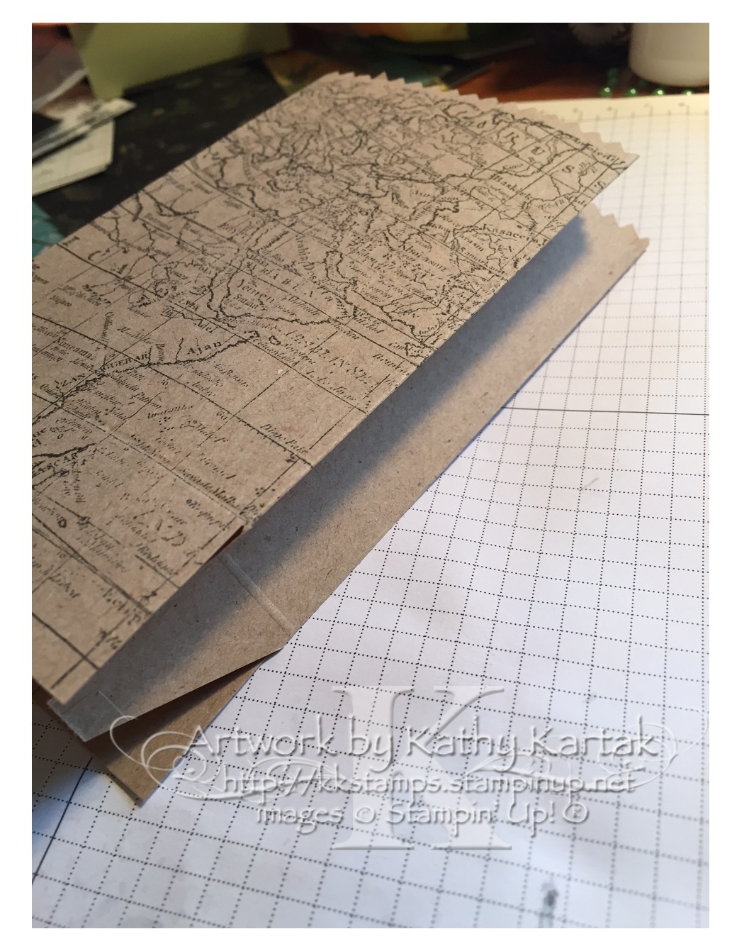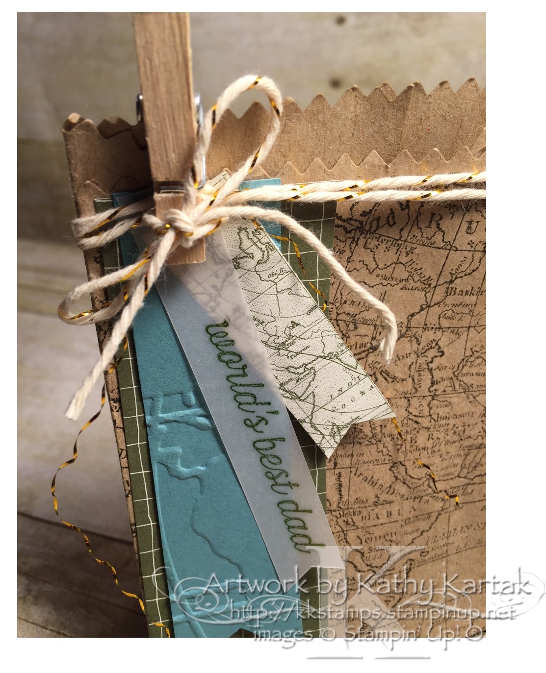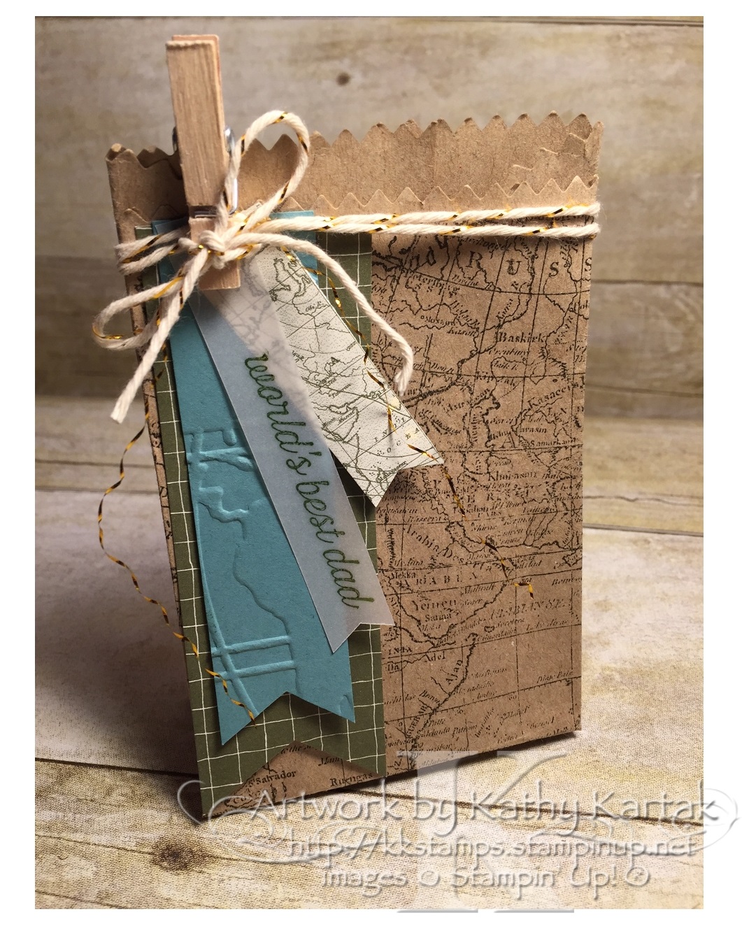 First up is a treat bag for Father’s day. I stamped the “World Map” background stamp (retiring) onto a Kraft Tag-a-Bag Gift bag in Early Espresso ink. Since the image from the background stamp is slightly smaller than the gift bag, I turned it into a gusseted bag.