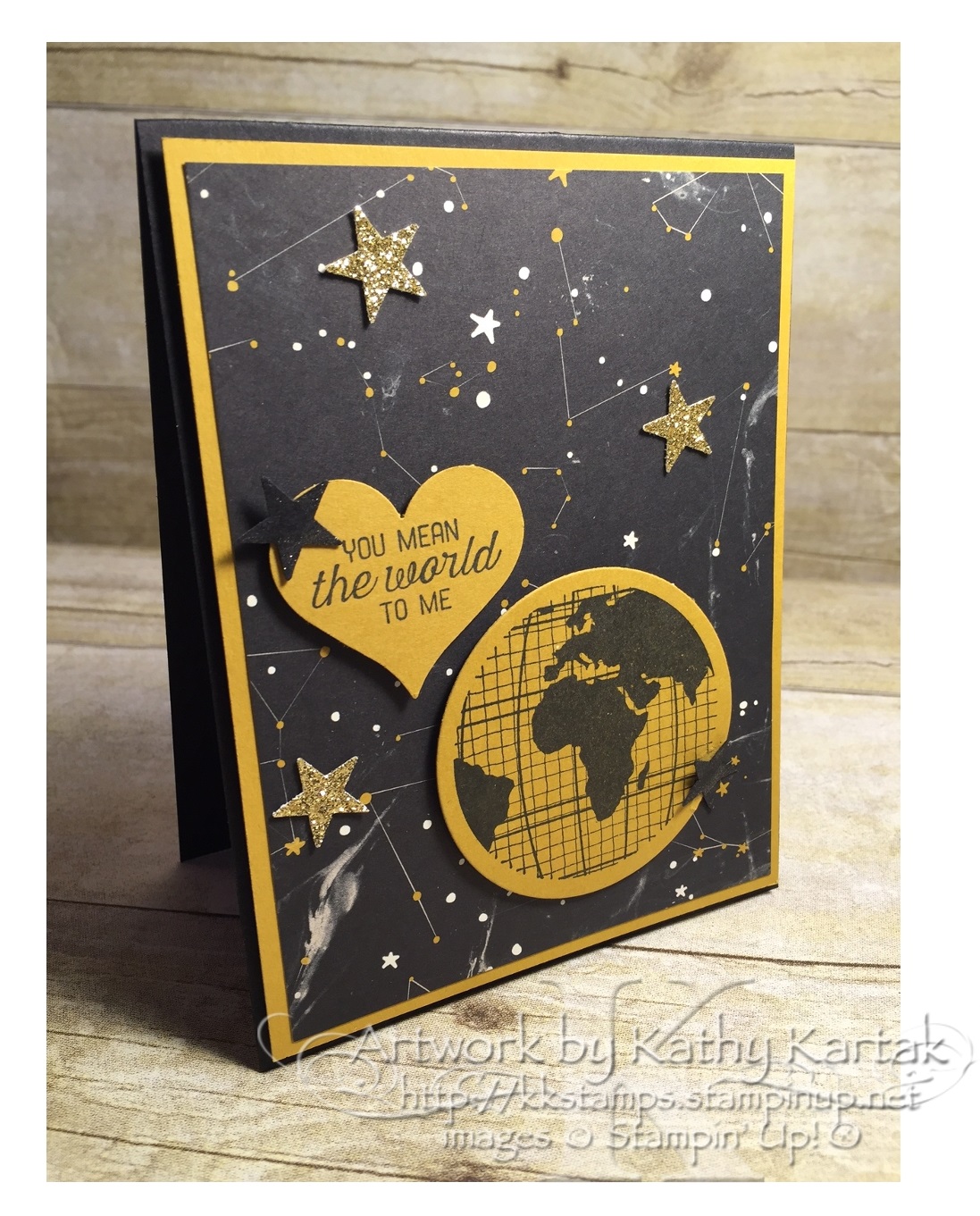 I adhered the starry sheet of DSP to a Delightful Dijon mat and then adhered these to a Basic Black Card Stock card base with Stampin’ Dimensionals. I stamped the globe from the “Going Global” set in Basic Black Archival Ink onto a piece of Delightful Dijon cardstock. I cut this out with one of the Circles Framelits (retiring–but there will be NEW layering framelits in the new catalog!) so that some of the Delightful Dijon would remain around the edge. I stamped a sentiment from the “Going Global” set in Basic Black Archival Ink onto Delightful Dijon and punched it out with the Sweetheart Punch. I added these elements to the card using Stampin’ Dimensionals.