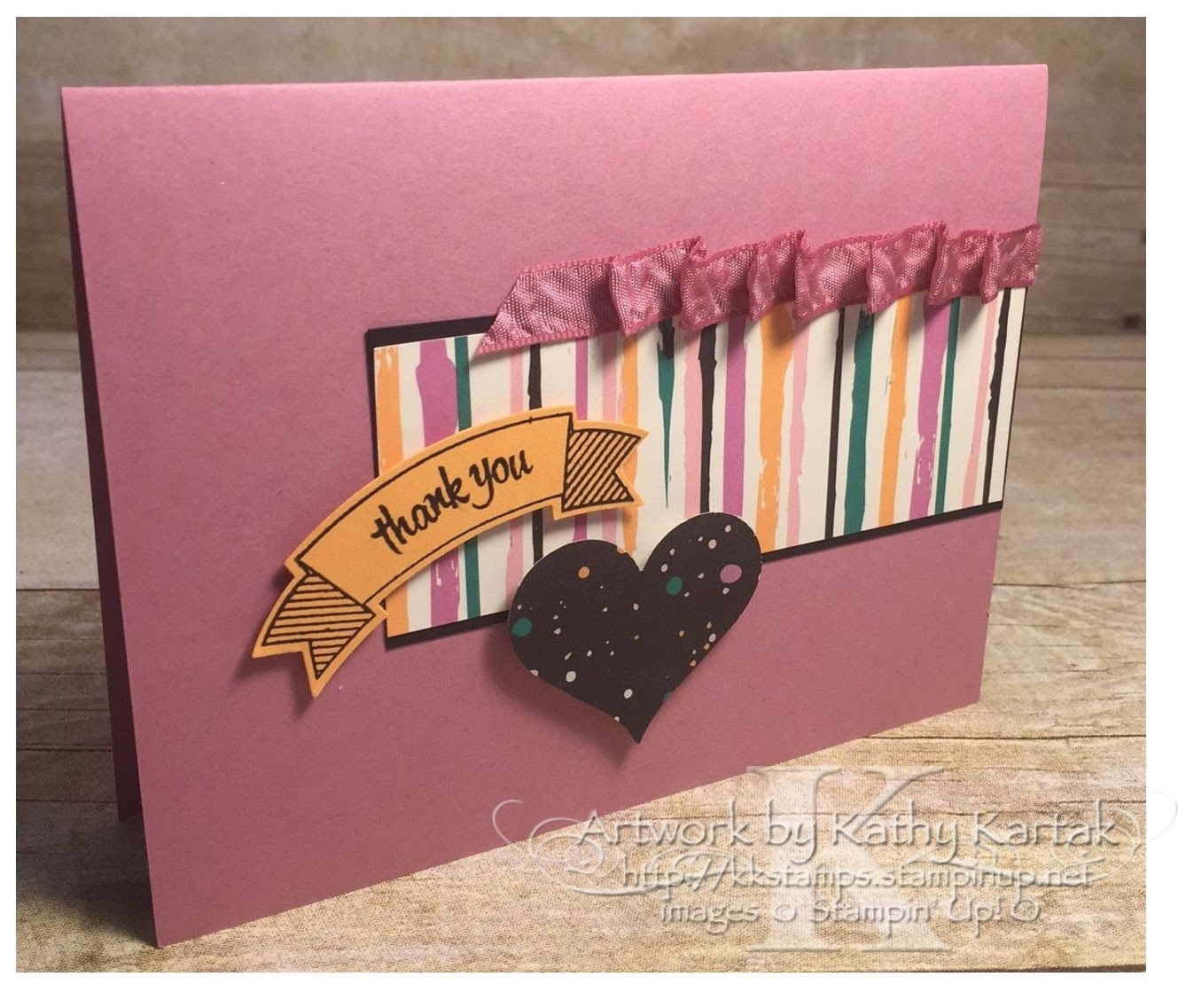 I started with a Sweet Sugarplum card base. I added a strip of Playful Palette Designer Series Paper and backed it with a just larger piece of Basic Black Card Stock. Next, I punched a heart with the Sweetheart Punch from another piece of Playful Palette DSP and added it to the card with a few Stampin’ Dimensionals.