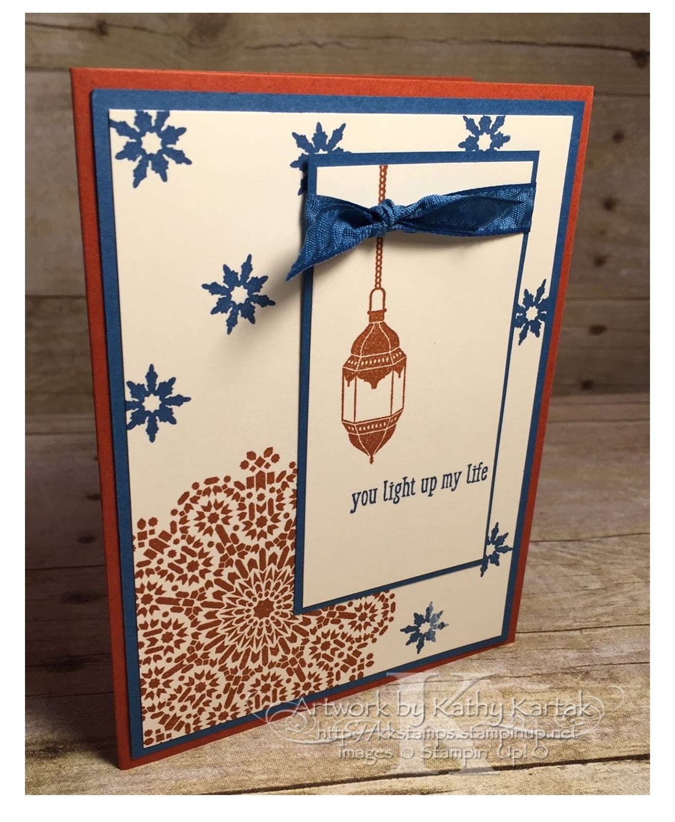 Next, I stamped one of the lanterns from the “Moroccan Nights” set in Cajun Craze onto a 2″ x 4″ Very Vanilla piece. I stamped a sentiment from the “Pun Intended” host set in Dapper Denim. I adhered this to a just-larger piece of Dapper Denim. I tied a length of Dapper Denim Ruched Ribbon around the top of this piece before adhering it to the card.