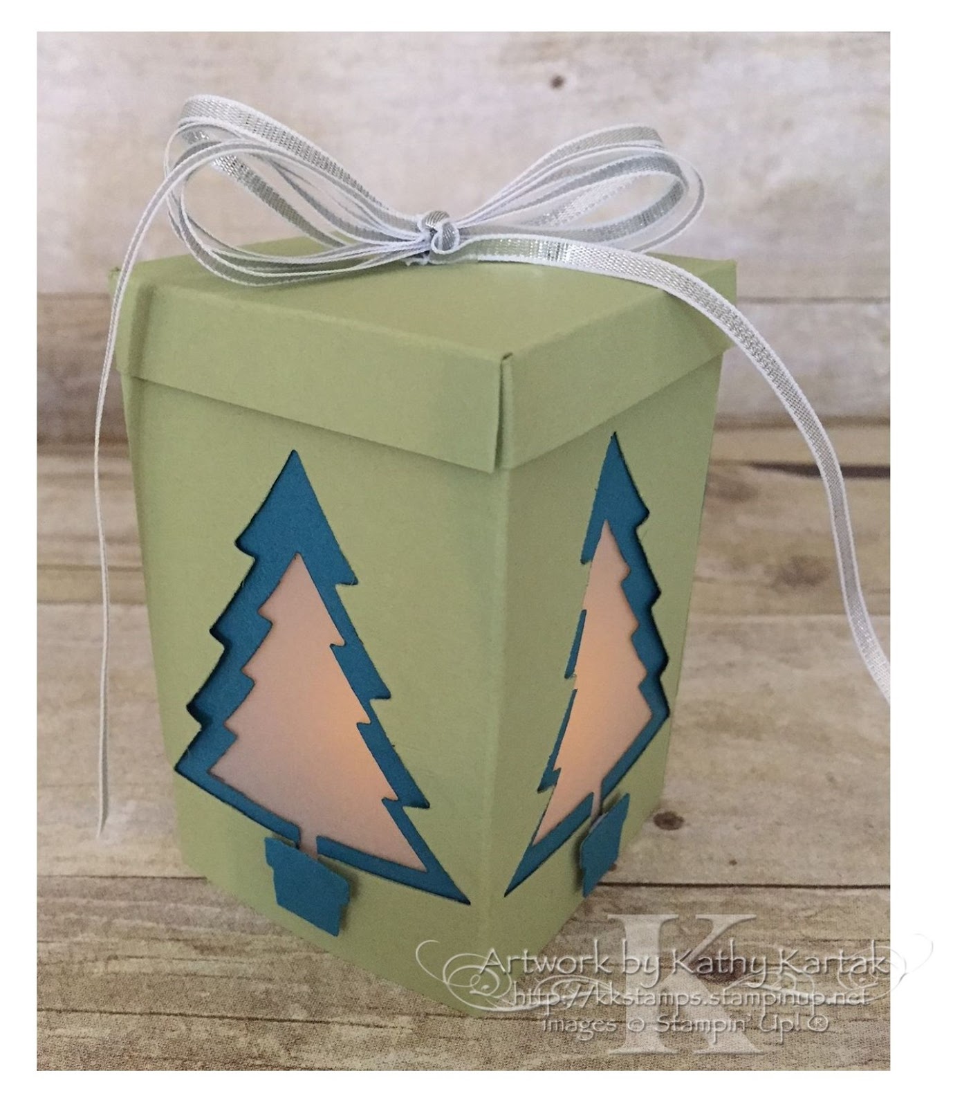 I wound some 1/8″ Silver Ribbon several times around a size D acrylic block, tied it in the middle, and then added it to the top of the box. Now it looks like a Christmas gift! I placed a battery-operated flickering candle inside. The glow is so soft and pretty.