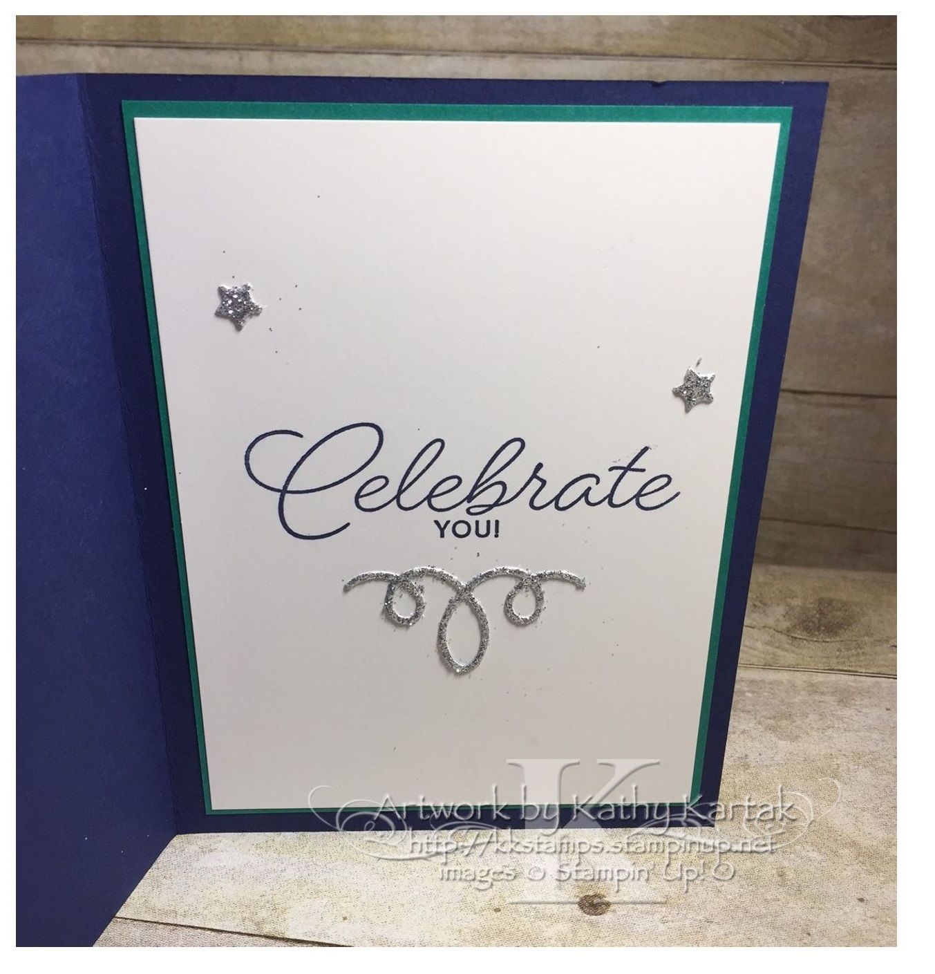 I stamped the “celebrate you” sentiment from the same stamp set in Night of Navy inside the card. I die cut the flourish from the Silver Glimmer Paper and adhered it to the card with the Fine-Tip Glue Pen. Finally, I used my two leftover stars inside, too adhering them with glue dots. Sweet!