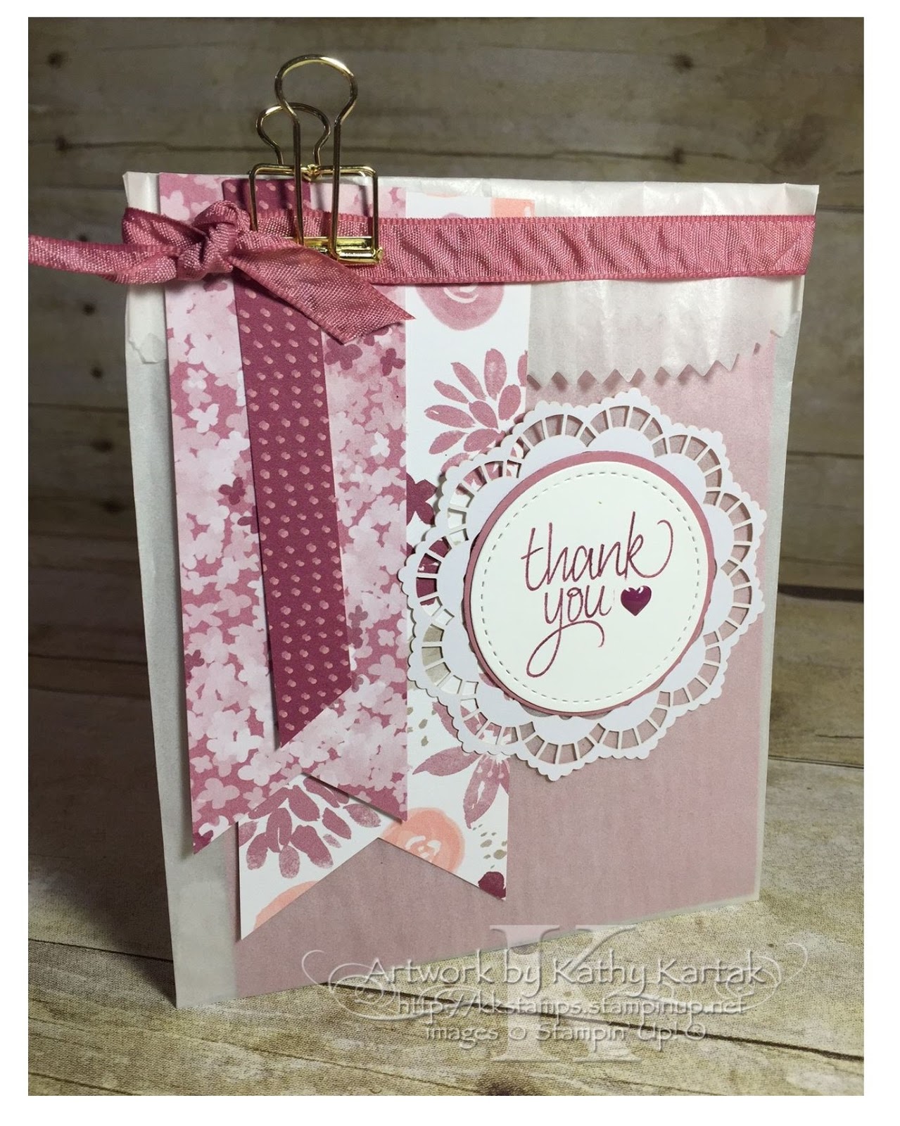 I wrapped a length of Sweet Sugarplum Ruched Ribbon around the bag, tied a knot, and slipped it under the Gold Binder Clip. Then I colored part of a stamp from the “All Things Thanks” set with a Rich Razzleberry Stampin’ Write Marker–that way I i could stamp just the “thank you” and not the rest of the sentiment. I stamped this onto a Whisper White scrap and cut it out with one of the Stitched Shapes Framlites. I punched a circle of Sweet Sugarplum Card Stock with the 2″ Circle Punch and adhered it to the white side of a Lace Doily. I adhered the doily to the bag and the stamped circles to the doily. For a finishing touch, I added a heart-shaped Rich Razzleberry Enamel Shape to the design.