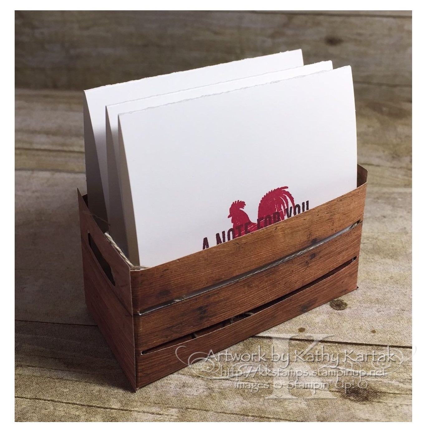 Bermuda Bay, Crushed Curry, and Real Red Inks and the sentiments in Early Espresso Ink. See that strip of Wood Textures Designer Series Paper at the bottom of the cards? Don’t you just love it? There are 48 sheets of different wood textures in the 6″ by 6″ DSP stack. I can’t wait to play some more with them! For a finishing touch we tied on a length of linen thread.