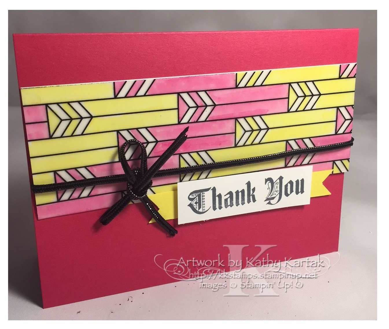 For this card, we colored a 5-1/2″ by 2″ strip of the Graceful Glass Vellum with the new Light Lovely Lipstick and Light Pineapple Punch Stampin’ Blends (available mid-June). I used four strategically placed Glue Dots to adhere my colored vellum piece to a 5-1/2″ by 2″ Whisper White Card Stock strip before adhering it to a Lovely Lipstick Card Stock card base. I wrapped a length of the 1/8″ Black Cord–also from the Graceful Glass Suite–around the card and tied it into a bow.