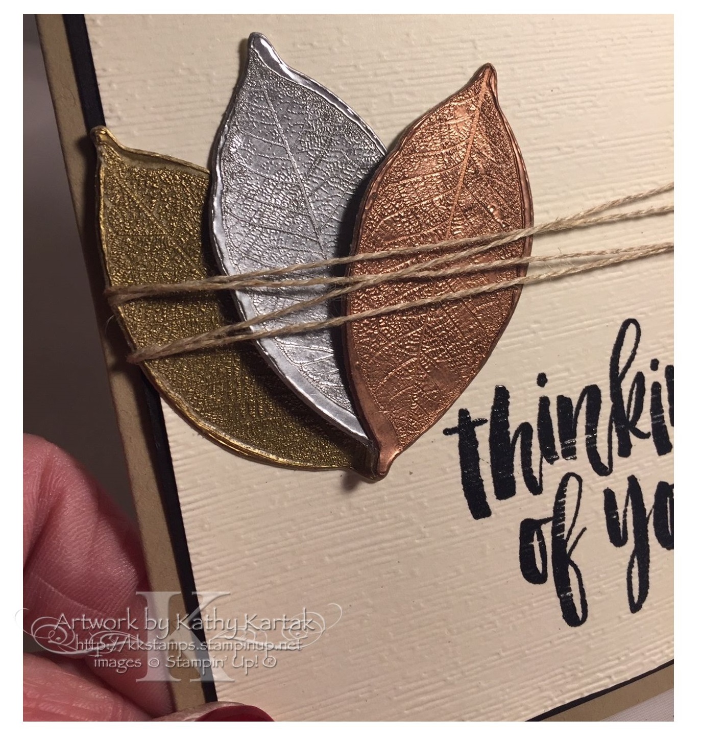 I adhered the Very Vanilla panel to a 3-7/8″ by 5-1/8″ Basic Black Card Stock mat. I adhered the embossed leaves to the card with Snail Adhesive and then I wrapped some Linen Thread around several times before adhering everything to a Crumb Cake Card Stock card base.