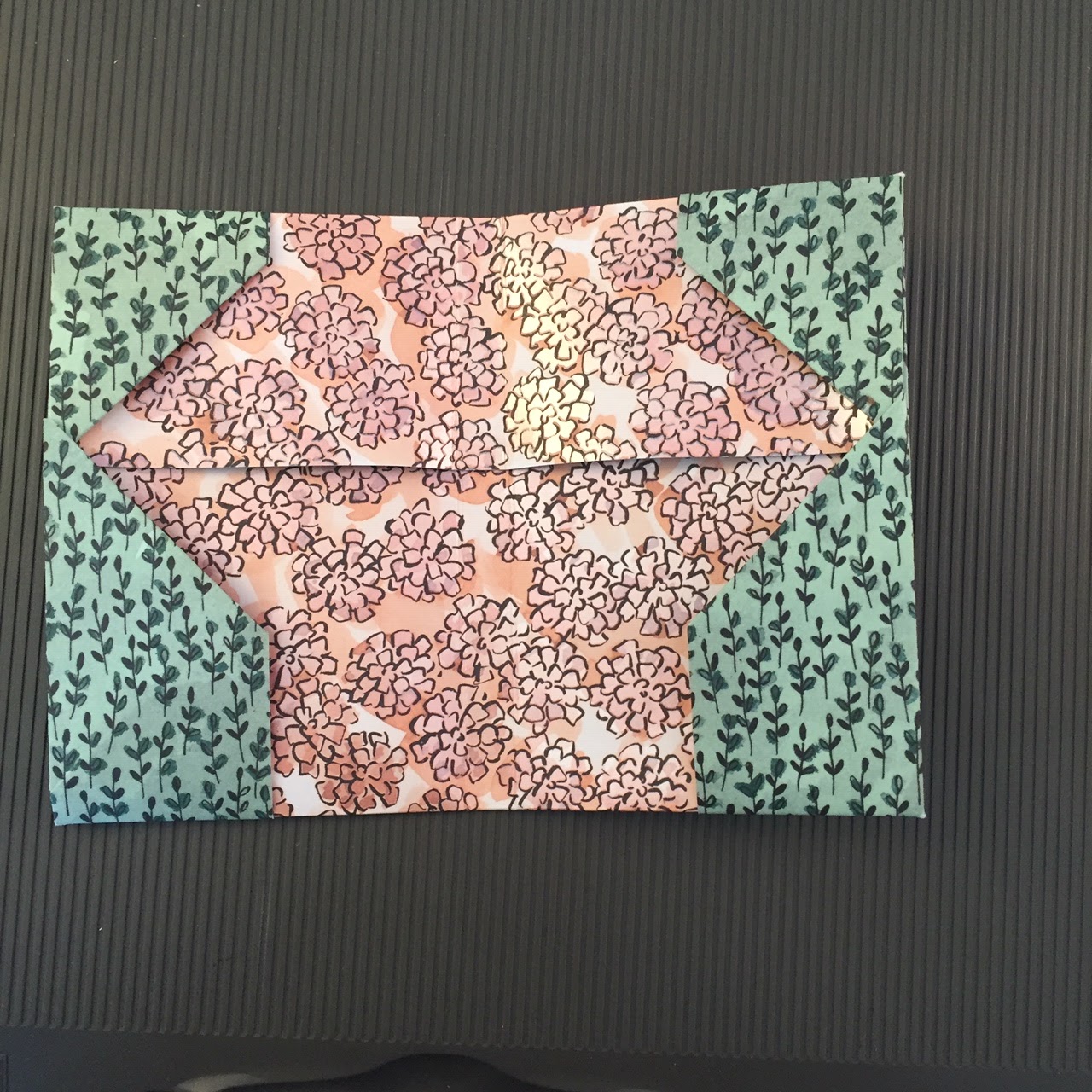 Here’s how to make this easy-peasy note card holder. This holder uses one piece of 12″ by 12″ designer series paper (multi-directional paper is best) and a little extra for the belly band. It holds four 5″ by 3-1/2″ Note Cards and Envelopes (item 131527).