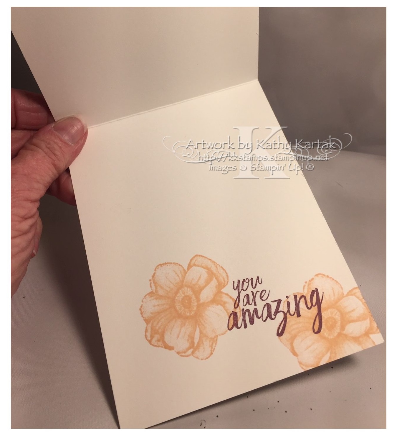 On the inside, I stamped a sentiment from the “All Things Thanks” stamp set in Fresh Fig Ink and added two flowers from the “Painted Seasons” set in Petal Pink.