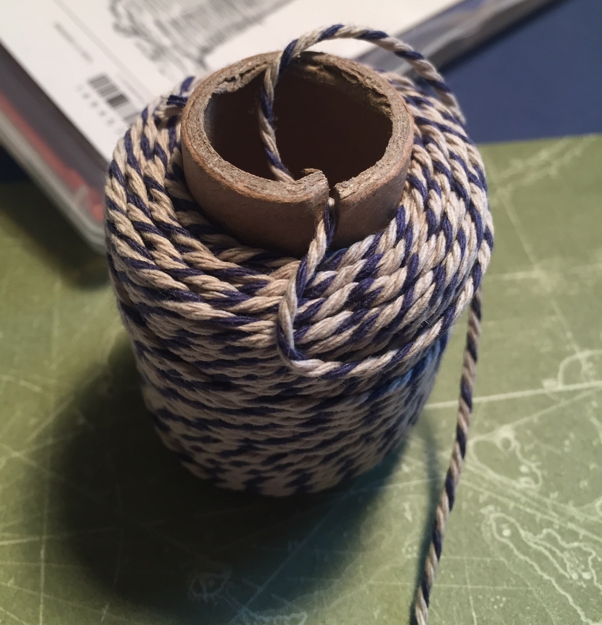 I store my ribbons in a drawer. They stay pretty well organized in there, but the twines that come on a spool tend to roll around and unspool and that drives me just a little bit crazy. Here’s what your spool of Night of Navy/Sahara Sand Baker’s Twine looks like when you receive it.
