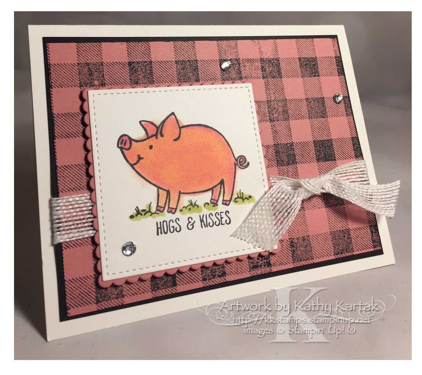 I cut out the pig with a square Stitched Shape Die and adhered it to a scalloped Rococo Rose Card Stock mat that I cut with one of the Layering Squares Dies. I adhered this piece to the card with Stampin’ Dimensionals.