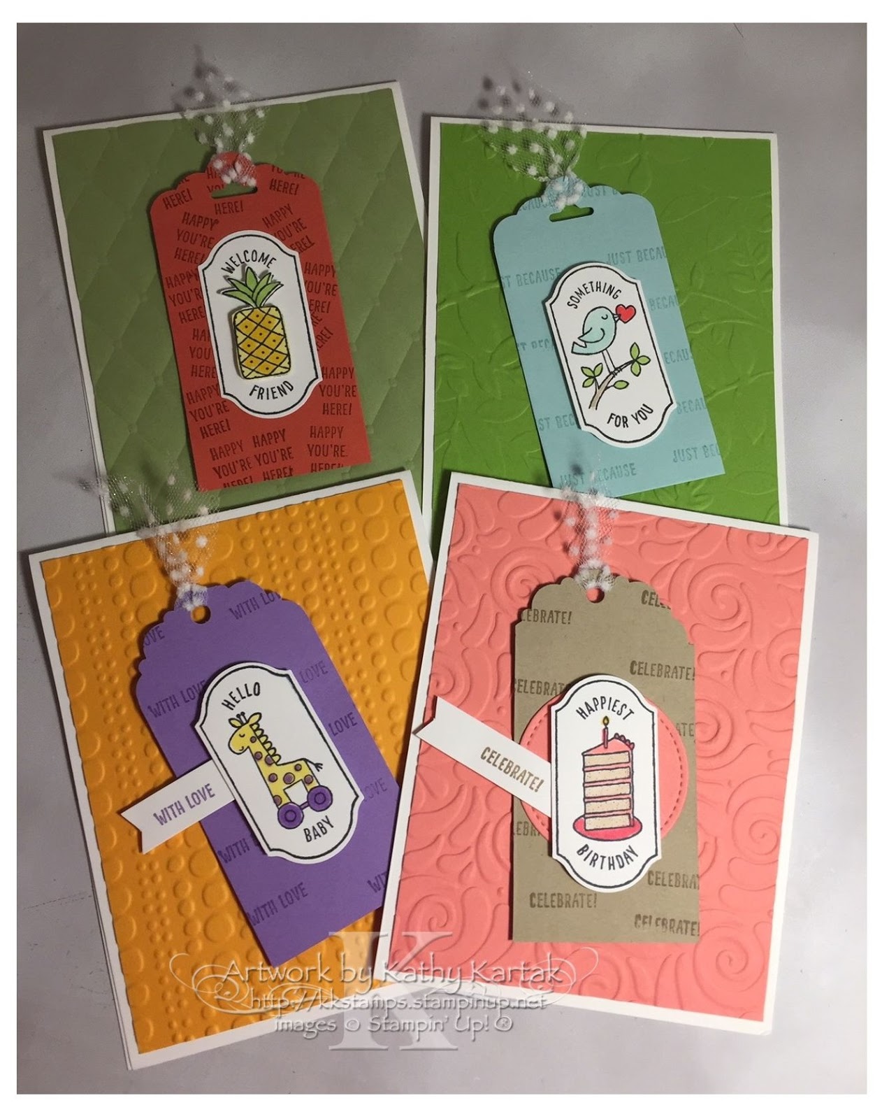 #stampinup #faithfulinkspirations #ManicMonday Today I have four quick and easy cards all using the “Time for Tags” host stamp set and the same layout. We made these at the Proverbial Stampers & Friends gathering and they’re so cute! Take a look.