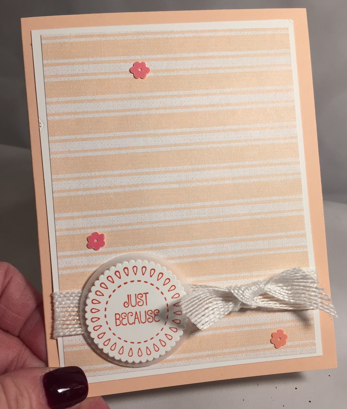 Did you notice that I used a variety of “pinks” on the card–and that they coordinate nicely? All the elements on your card don’t have to “match”–they just have to coordinate.
