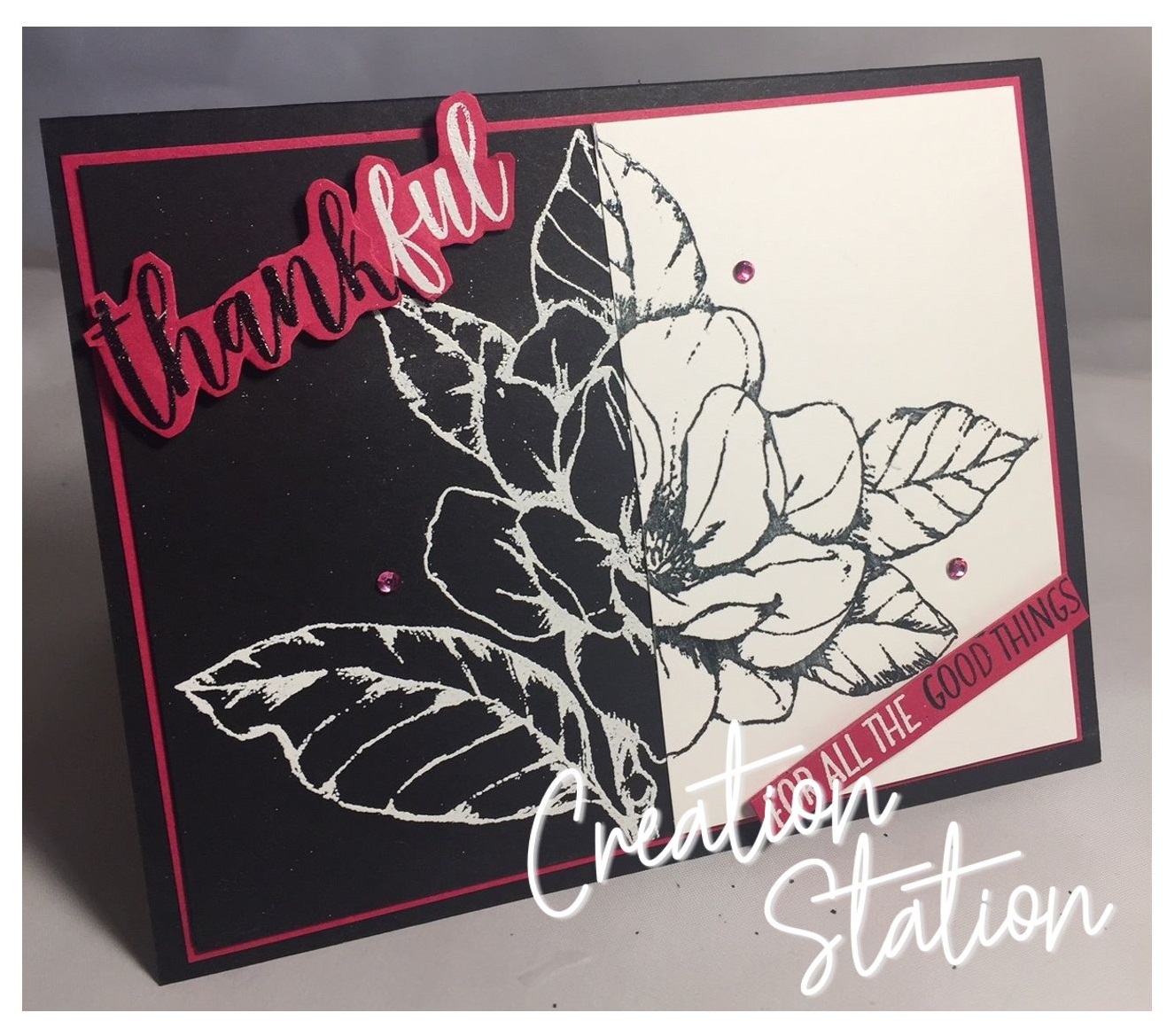 Our Creation Station Design Team is bringing you projects with the theme of black and white and a pop of color. This is one of my favorite hops! I love to make black and white cards and add a pop of color. I chose Lovely Lipstick as my color pop and I used the split negative technique for the black and white portion.