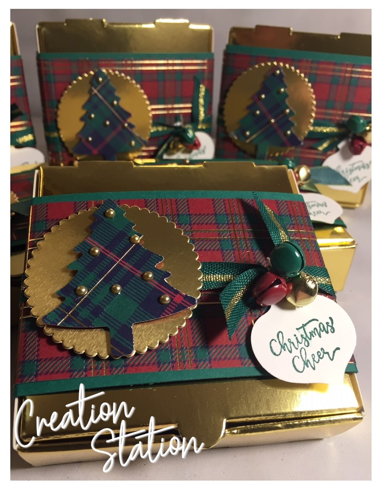 I just love your Gold Mini Pizza Boxes all wrapped up in Plaid, cute Jingle Bells and a lovely finishing touch with the Gold Metallic Pearls.
