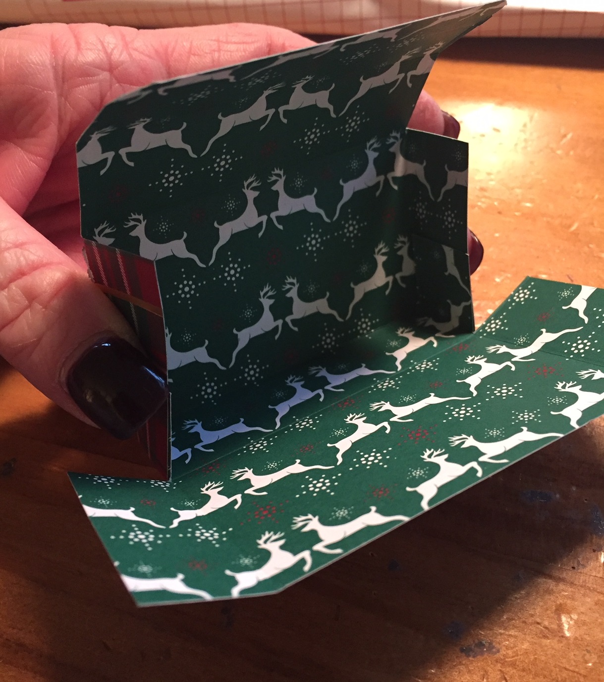 These boxes are so easy to make. I started with a 4-1/2″ by 6″ piece of Wrapped in Plaid DSP. On the short end, score at 3/4″ and 3-3/4″. Turn a quarter turn and score the long end at 1″, 1-3/4″, 3-1/2″, and 4-1/4″. Fold all the score lines.