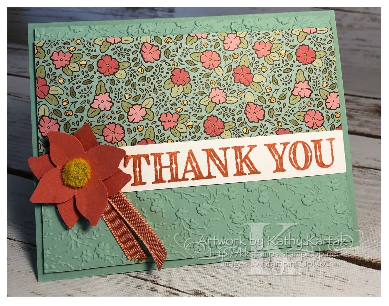 Next, I stamped “thank you” from the “Ornate Thanks” stamp set in Terracotta Tile Ink onto a 3/4″ by 4-1/4″ Whisper White strip. I adhered this to the card just under the DSP. I adhered a length of Terracotta Ribbon from the Ornate Garden Ribbon Combo Pack to the card.