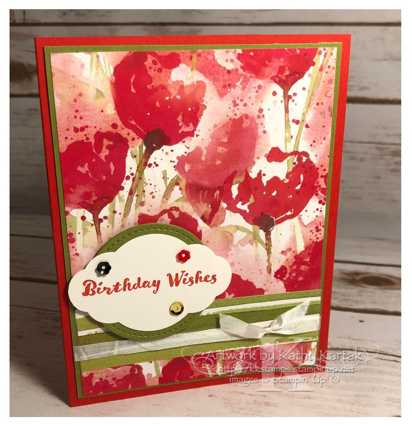 I started by cutting the smallest circle in the Stitched Shapes Dies from the center of a 4″ by 5-1/4″ piece of Old Olive Card Stock. I adhered a 3-3/4″ by 5″ piece of Peaceful Poppies Designer Series Paper (retiring) to the Old Olive mat. Then I adhered a 1″ by 3-3/4″ striped piece of Peaceful Poppies DSP on top and wrapped a length of 1/4″ Whisper White Crinkled Seam Binding around before adhering to a Poppy Parade Card Stock card base.