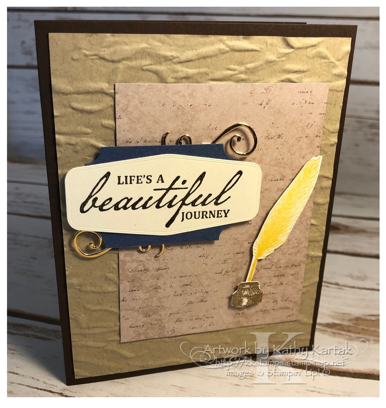 I stamped the quill image in Bumblebee Ink onto Very Vanilla Card Stock and cut it out with the matching World Map Die. I stamped the inkwell in Soft Suede Ink onto Very Vanilla cut it out with its matching World Map Die, too. I adhered these to the card with Mini Stampin’ Dimensionals.