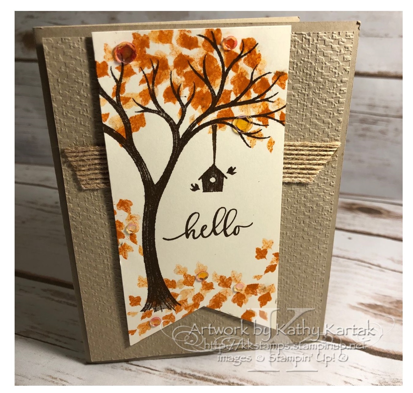 She started with a 2-1/2″ by 5″ Very Vanilla Card Stock strip and flagged the end with her Paper Snips. Then she stamped the tree, bird house, and sentiment in Early Espresso Ink. Next, she stamped the leaves on the tree–and falling from the tree (she’s so clever!)–in Cajun Craze Ink, both full strength and stamped off.
