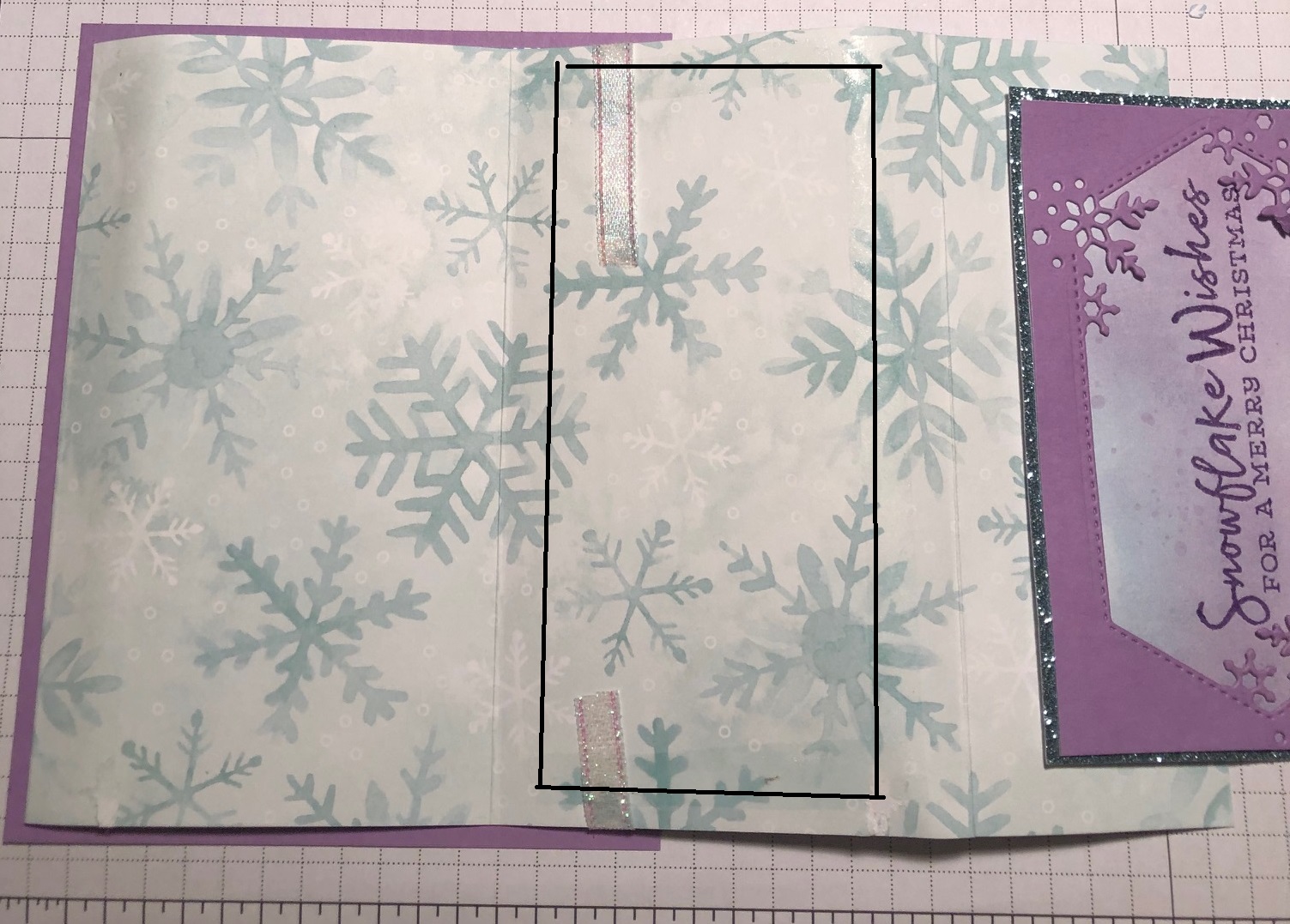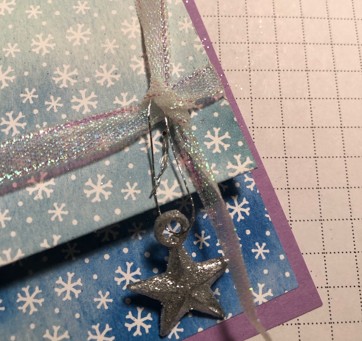 You won’t waste ribbon where it won’t be seen if you “cheat” it around the back of your card as shown above. The box shows your adhesive placement and you’ll fold it over to the left. The front of this piece will look like the next picture and you can use another piece of ribbon slipped underneath to tie on your bow and Glitter Star Ornament.