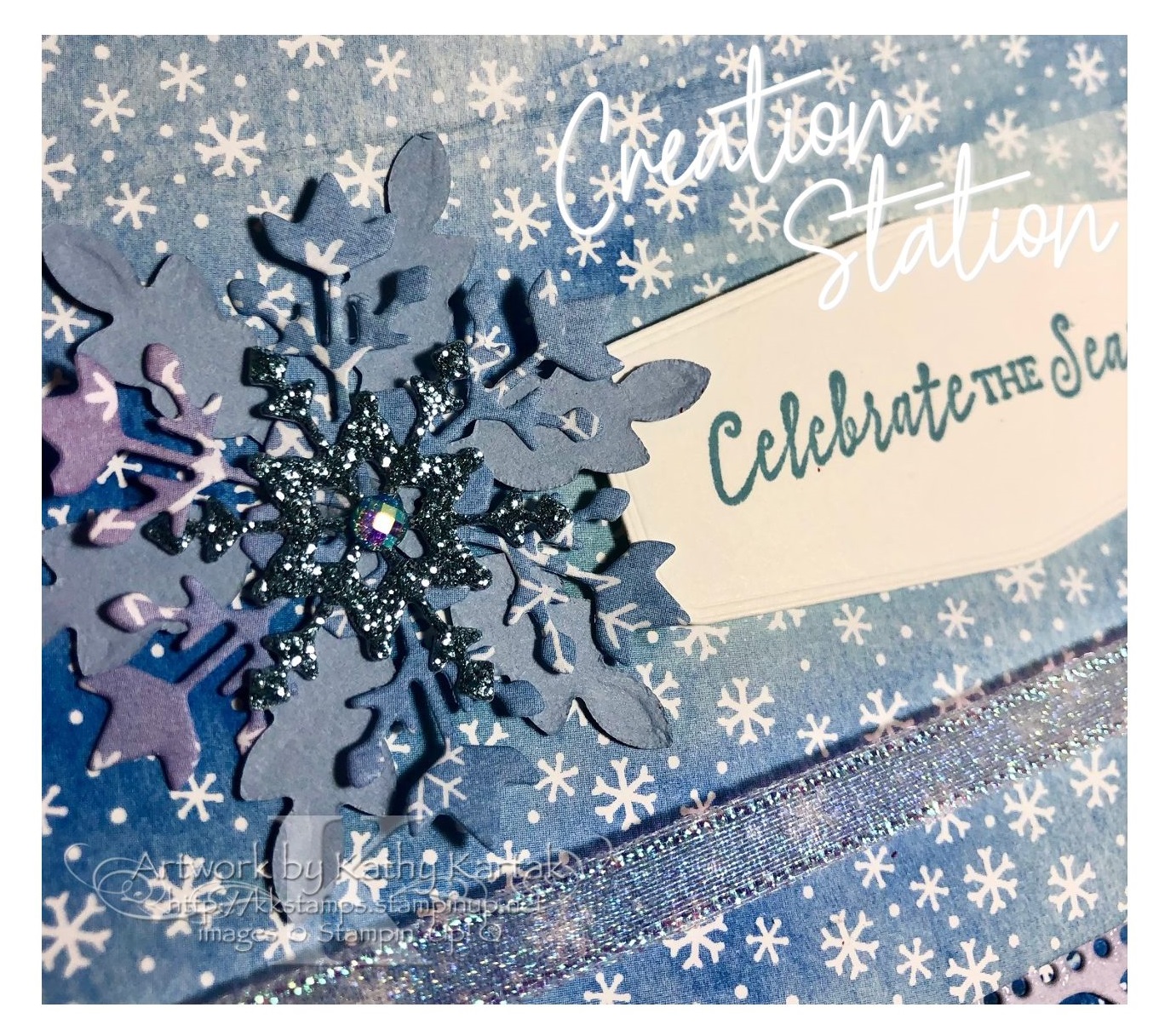 I had fun creating my project. I kept thinking of ways to make my card sparkle and shine. I did some experimenting–some things worked, others didn’t, but it was fun spending time being creative. For my card, I went with products from the wonderful Snowflake Splendor Suite on pages 36 through 38 of the July through December Mini Catalog. That was the first Suite that caught my eye when the mini was revealed and I only bought one thing–the entire suite. See, if you use the item number for the entire suite (155115) you get everything in the suite and you don’t have to feel bad because you only bought one thing!