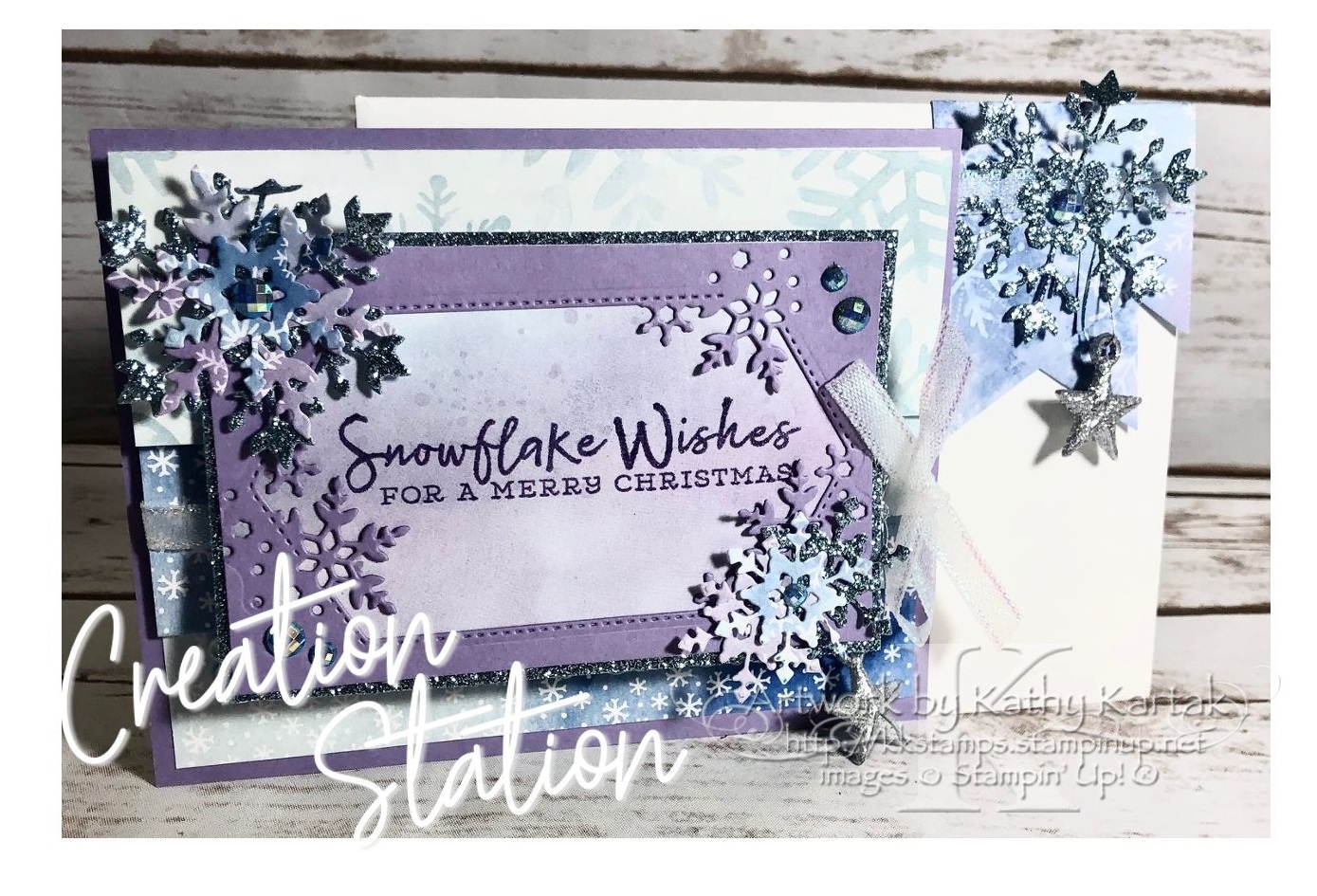 I really pulled out all the stops on this one! My card base is a quarter sheet (4-1/4″ by 5-1/2″) of Highland Heather Card Stock. I did a fun fold (keep reading for details) with the beautiful Snowflake Splendor Designer Series Paper. I used the So Many Snowflakes Dies to cut the window opening from a piece of Highland Heather Card Stock and to cut the snowflakes. I also used the sparkly Balmy Blue Shimmer Paper (2-7/8″ by 4-3/8″) and Blue Adhesive-Backed Gems. Oh! I almost forgot–I used the Snowflake Splendor Ribbon as well! I stamped the sentiment from the “Snowflake Wishes” stamp set in Gorgeous Grape Ink directly onto the Snowflake Splendor DSP and embossed it with Clear Embossing Powder to give it a little shine.