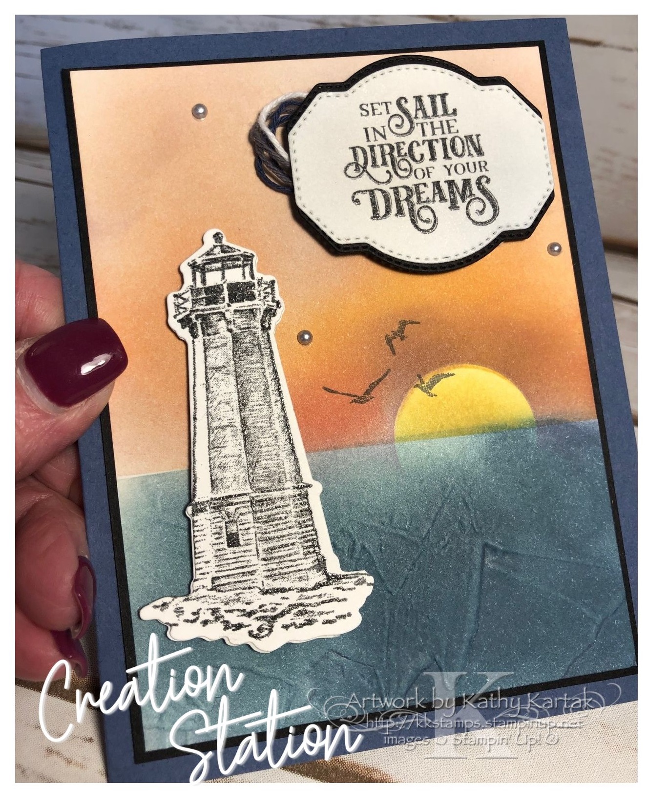 I stamped the lighthouse in Basic Gray Ink onto Basic White Card Stock, sprinkled on Clear Stampin’ Emboss Powder and then cut it out with the matching die. I did the same for the sentiment piece. I adhered the lighthouse to the card with Stampin’ Dimensionals.
